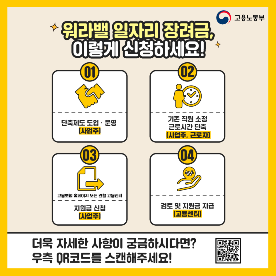 장려금을 신청하려면, 사업주는 취업규칙 등에 소정근로시간 단축관리 규정을 마련하고, 단축제도를 도입하여 운영해야 합니다. 최소 1개월 이상 연속해서 단축한 후, 고용보험 홈페이지(http://www.ei.go.kr)나 관할 고용센터를 통해 지원금을 신청할 수 있습니다.