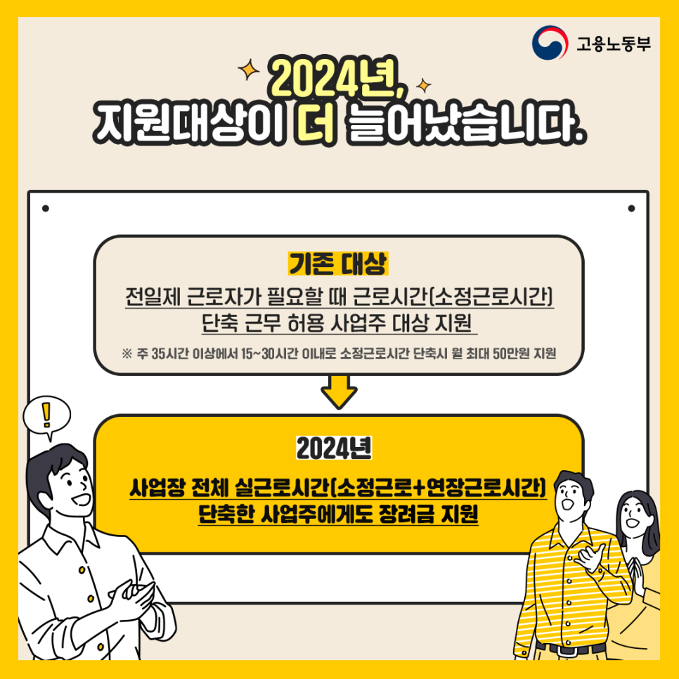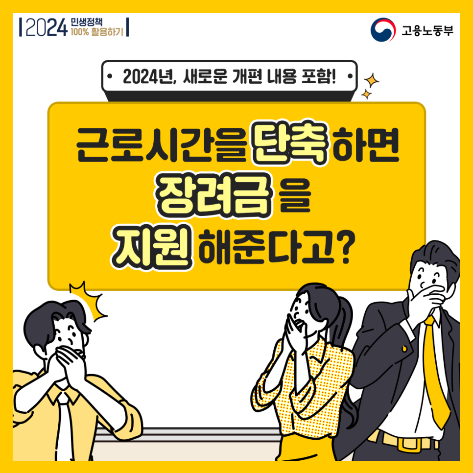 근로자의 주 평균 실근로시간을 2시간 이상 단축한 사업주는 지원 인원 1인당 단축 장려금 월 30만원을 3개월 단위로 1년간 지원받을 수 있습니다. 또한, 주 소정근로시간이 35시간이 넘는 근로자가 15시간 이상 30시간 이내로 주 소정근로시간을 단축하면 월 최대 50만원을 지원받을 수 있습니다.